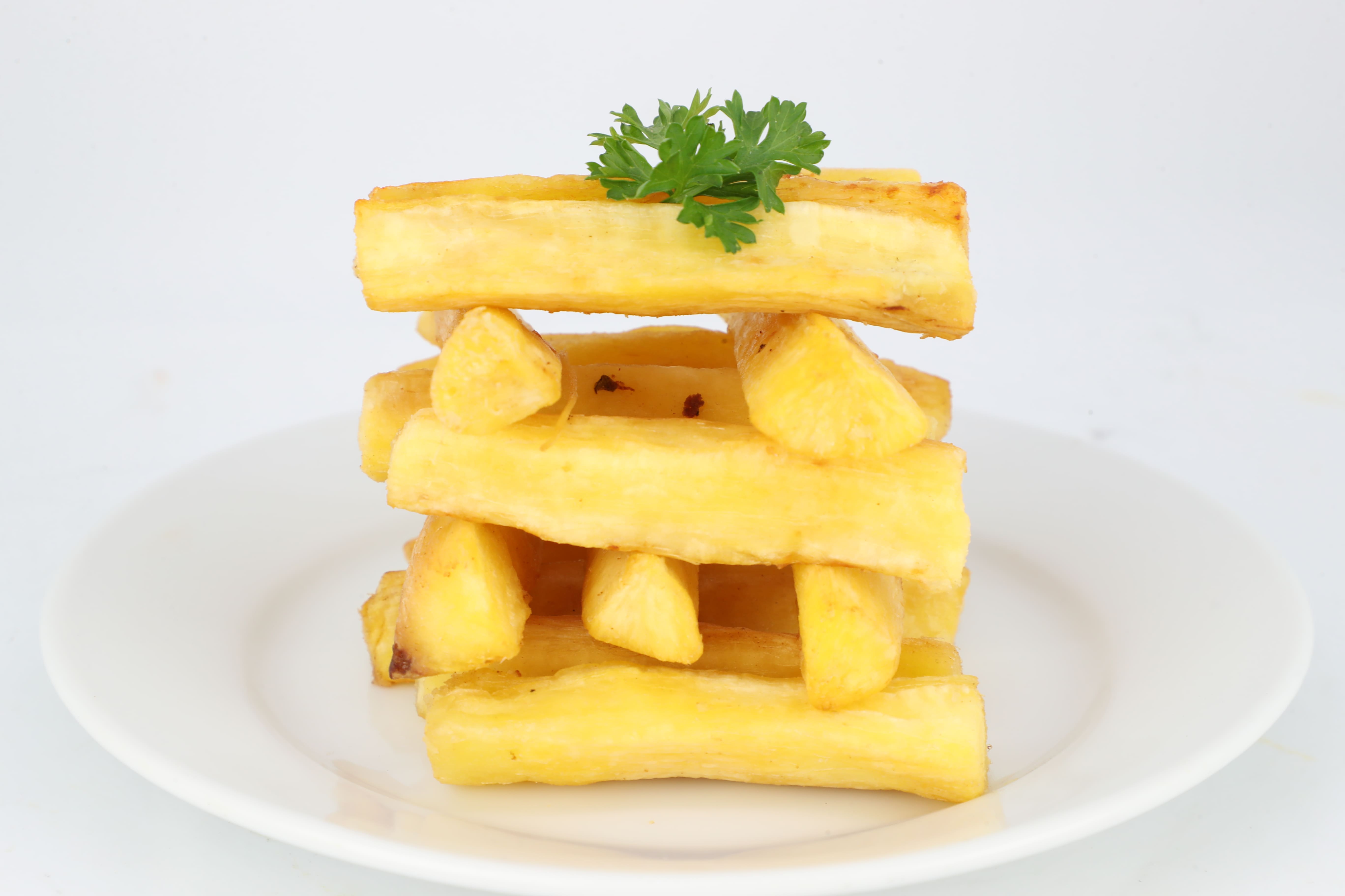 Jalea en trozos de pescado del día con yucas fritas, yuyo frito y zarza criolla.