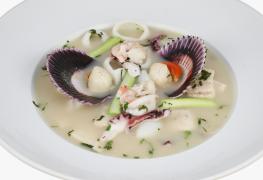 Chilcano de fondo y trozos de pescado, mixtura de mariscos, punto de leche de tigre.