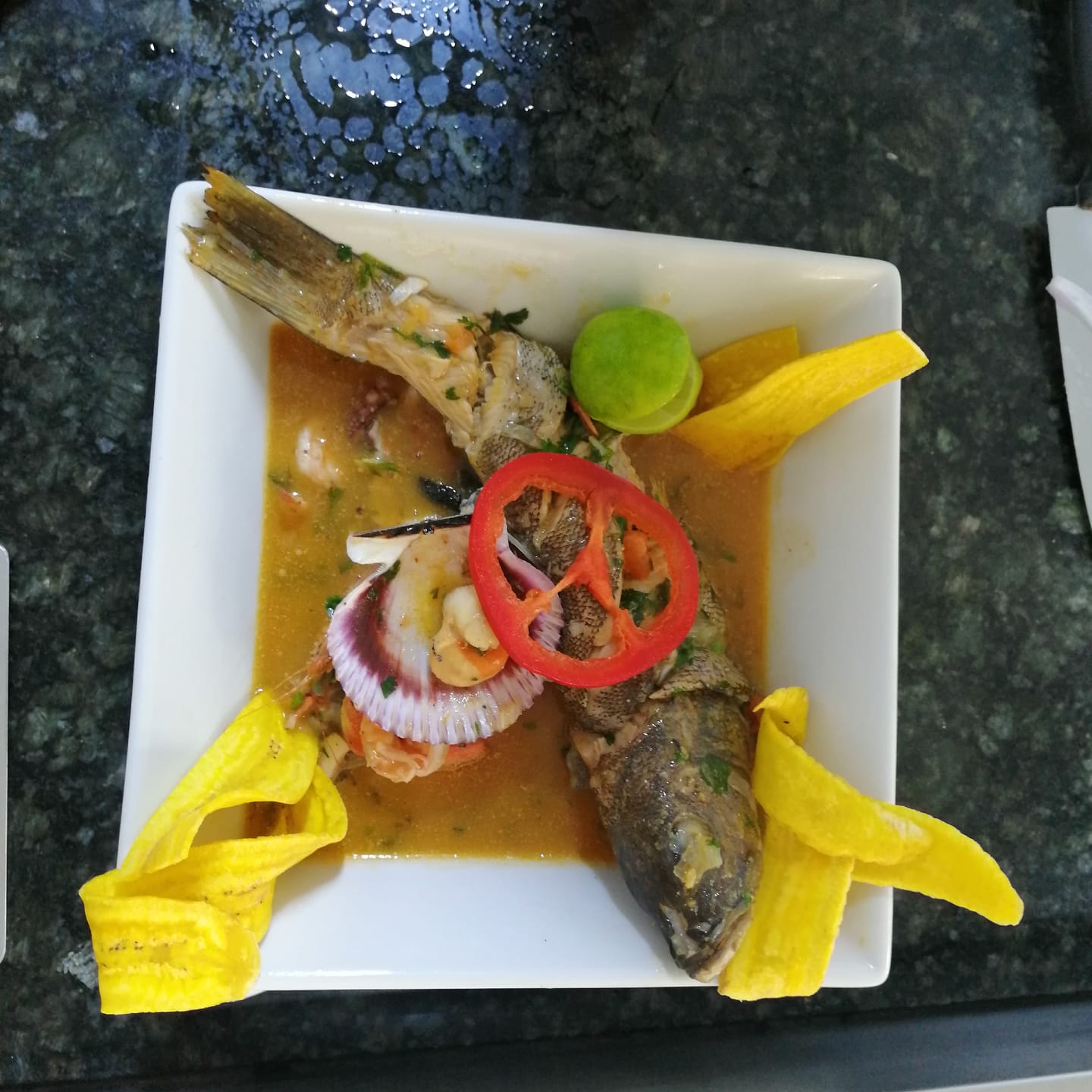 Trozos de pescado, mariscos, coronados con cangrejo popeye acompañado con yucas fritas, yuyo frito y zarza criolla.