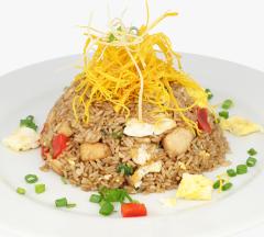 Chaufa de trozos en lomo fino, sillao y cebolla china.