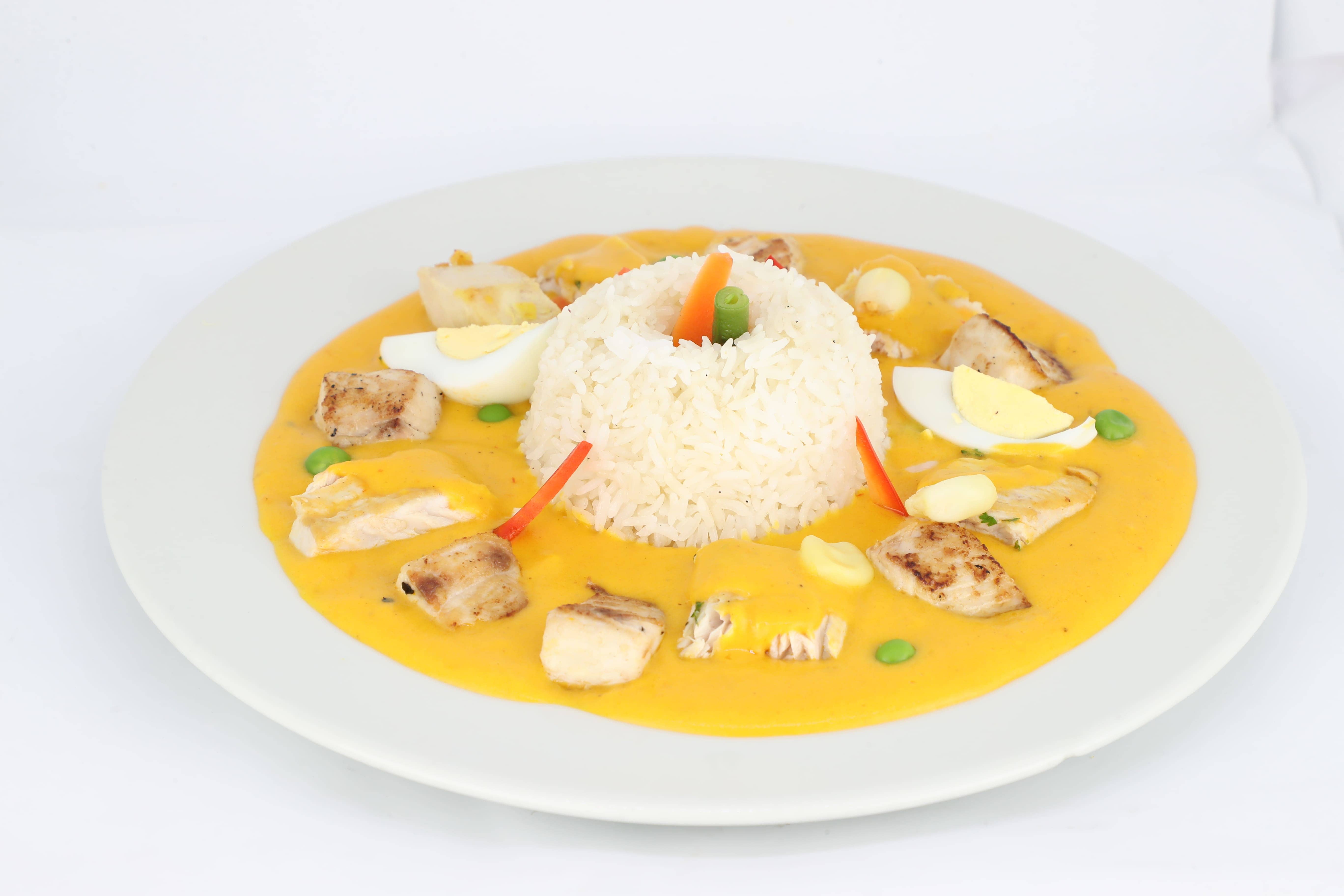 Finos trozos de pescado y mariscos de la estación, en mixtura de tres cremas vegetales , ají amarillo y rocoto.