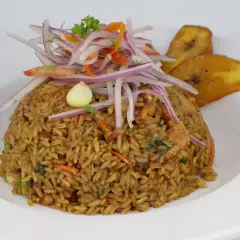 Tacú tacú con mezcla de frijol y arroz con lomo fino.