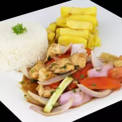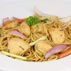 Tallarín flambeado con trozos de pollo, cebolla y tomate.