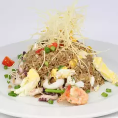 Chaufa de mariscos de la estación, saltado con huevo frito y cebolla china.