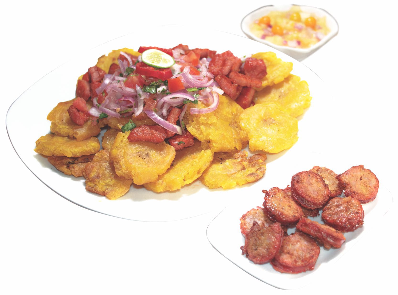 Crocantes patacones, rodajas de cecina y chorizo acompañado de zarza criolla.