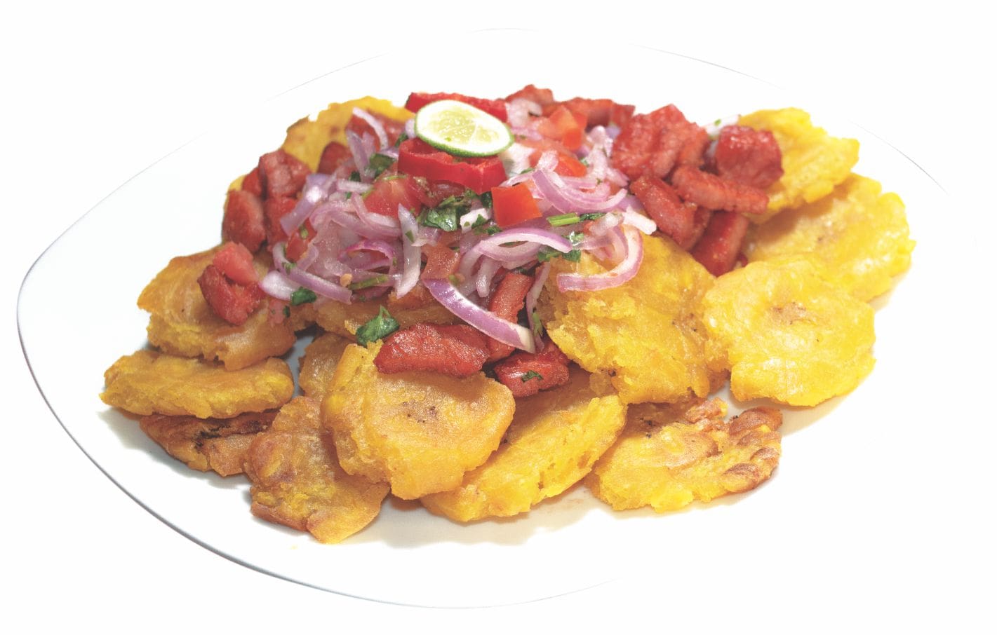 Crocantes patacones, rodajas de cecina acompañado de zarza criolla.