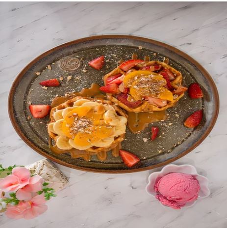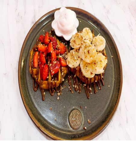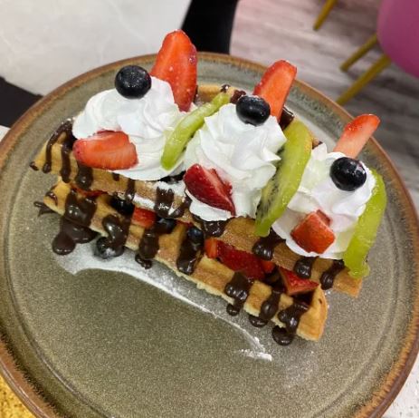 Waffle bañado con fudge crepero, crema chantillí, fresas, arándanos y kiwi.