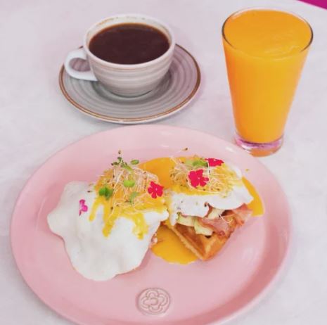 Waffles con palta laminadas, tocino, huevos a la inglesa cubierto con salsa holandesa más jugo de papaya o piña más café americano.