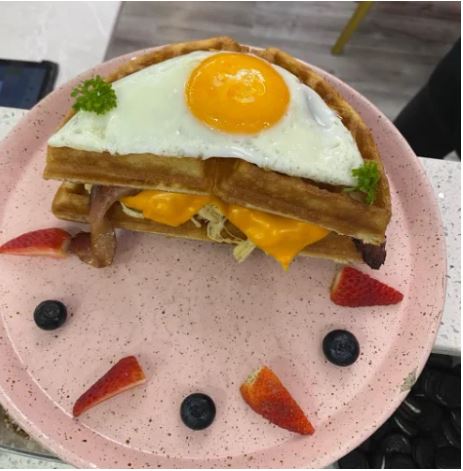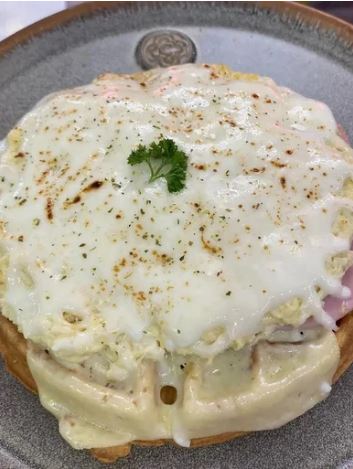 Sándwich en waffle acompañado de pollo deshilachado, mayonesa, tocino, gratinado con queso cheddar, cubierto con huevo a la inglesa.