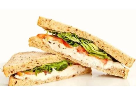 Pan pullman tostado con mantequilla, pechuga de pollo deshilachado, mayonesa, palta, tomate y orégano.