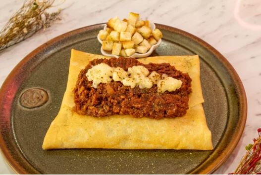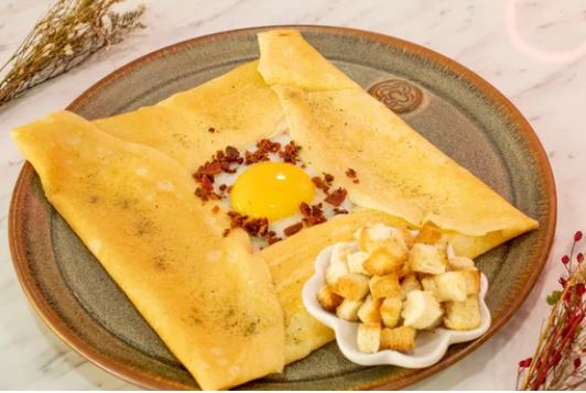 Crepe edam, jamón inglés, huevo, tocino y orégano.