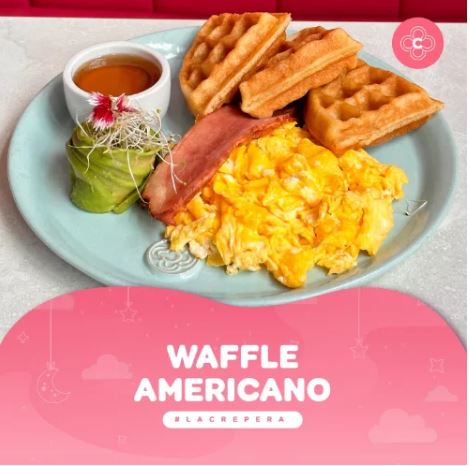 Waffles crocantes, huevos revueltos o fritos, tocino, palta, acompañado con tostadas, jugo de papaya o piña más café americano.
