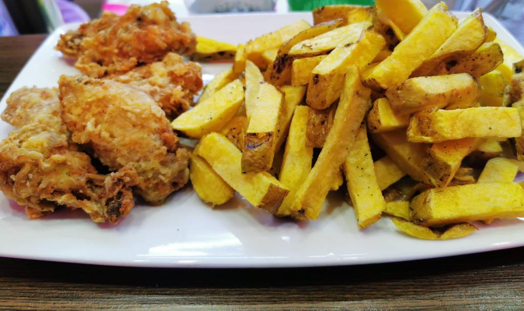 Alitas empanizadas, acompañadas de papas nativas y cremas.