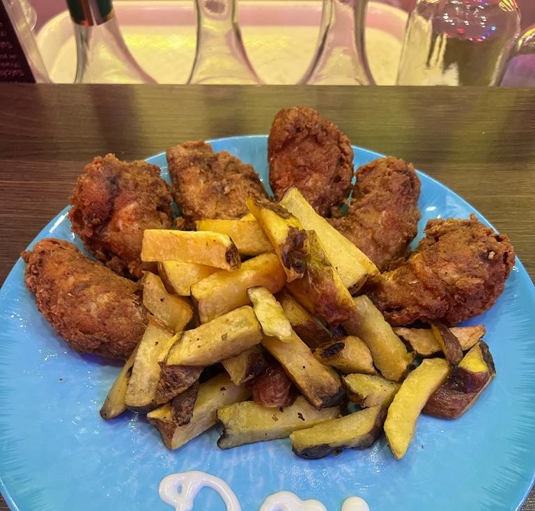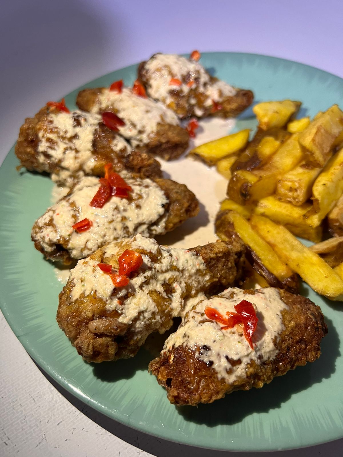 Alitas empanizadas con picante, acompañadas de papas nativas y cremas.