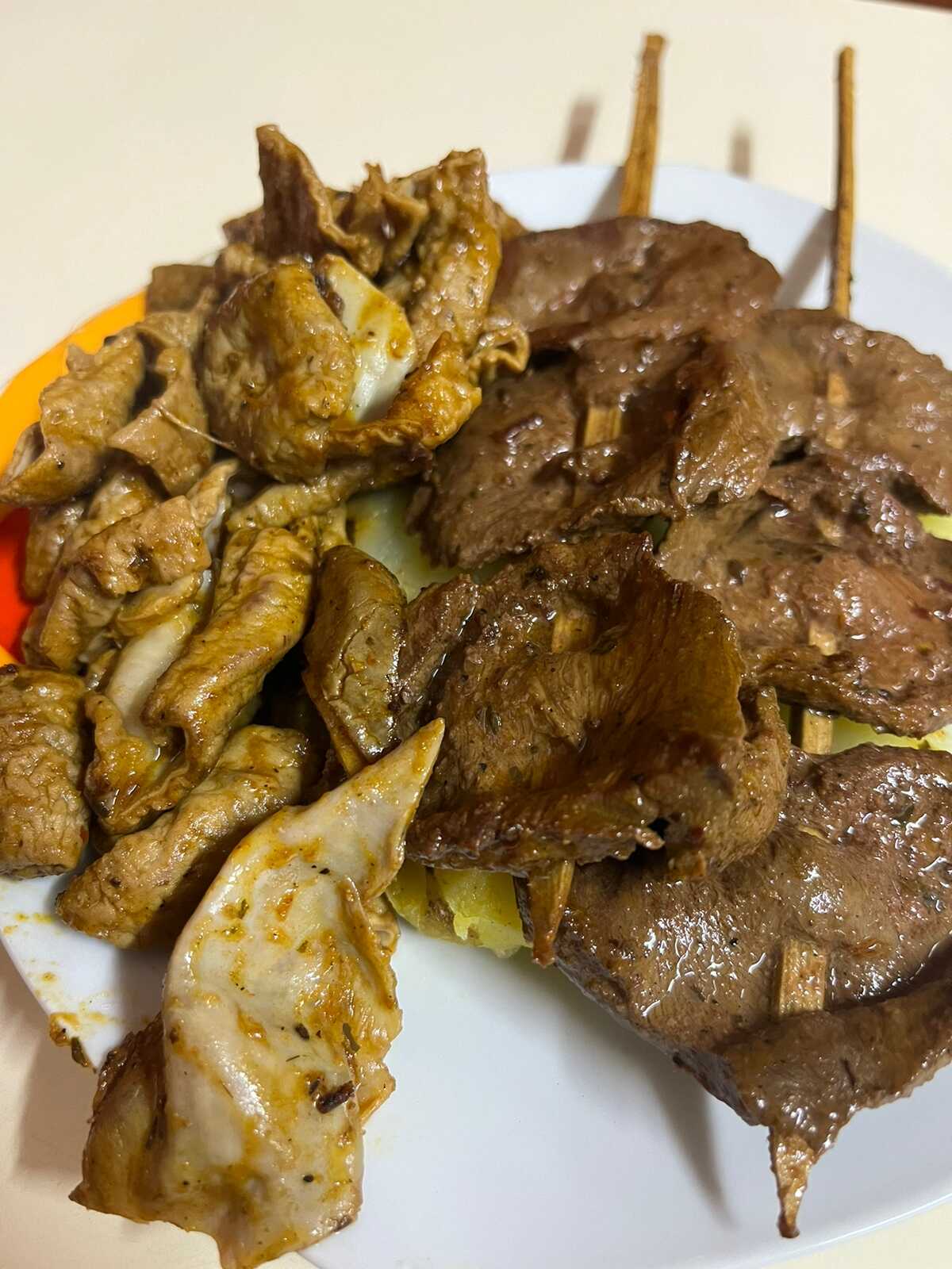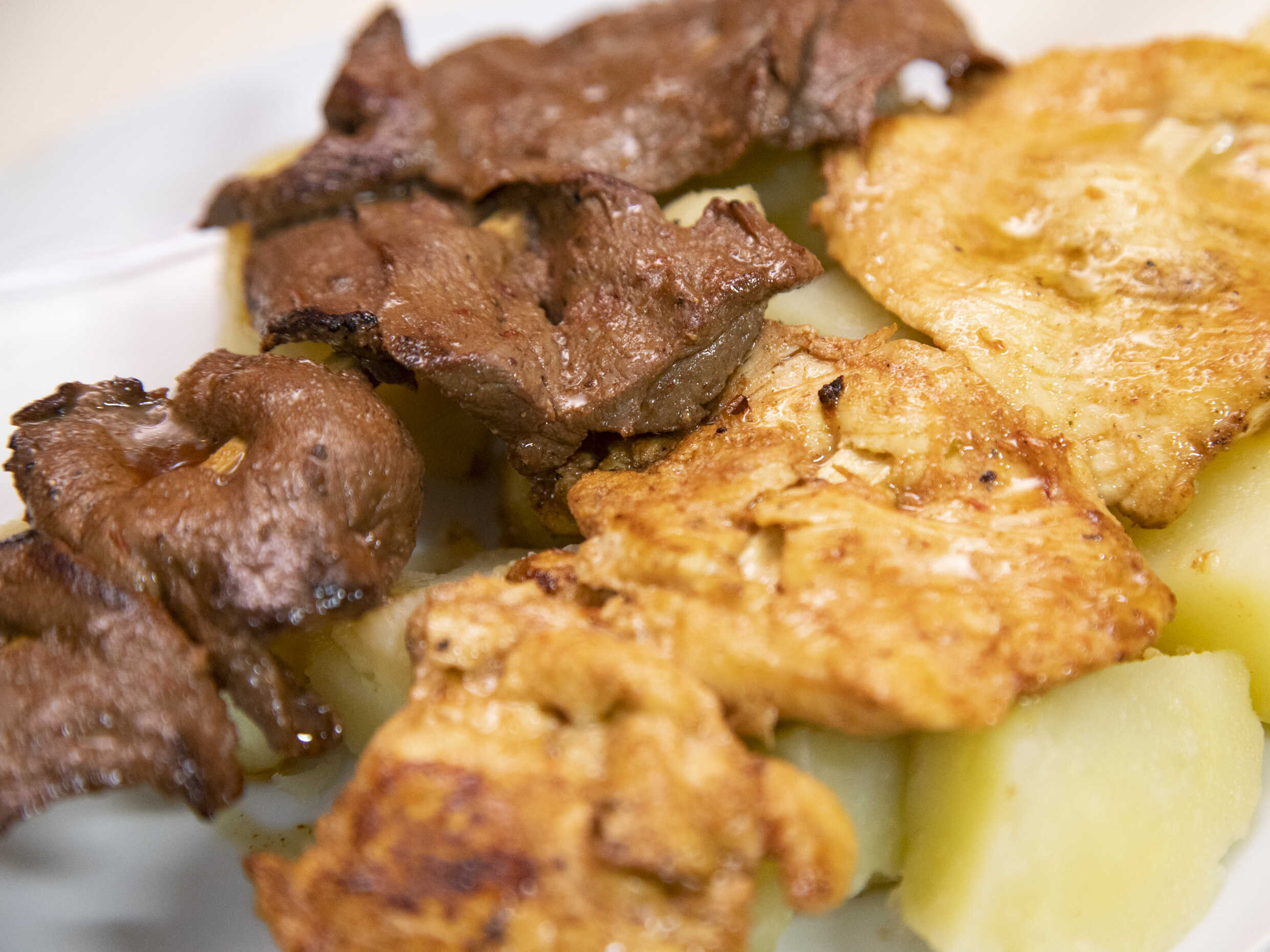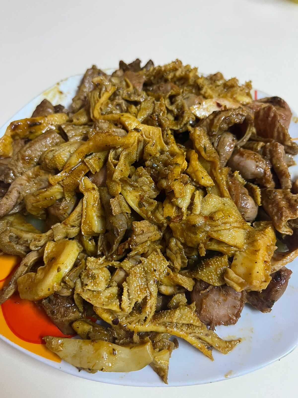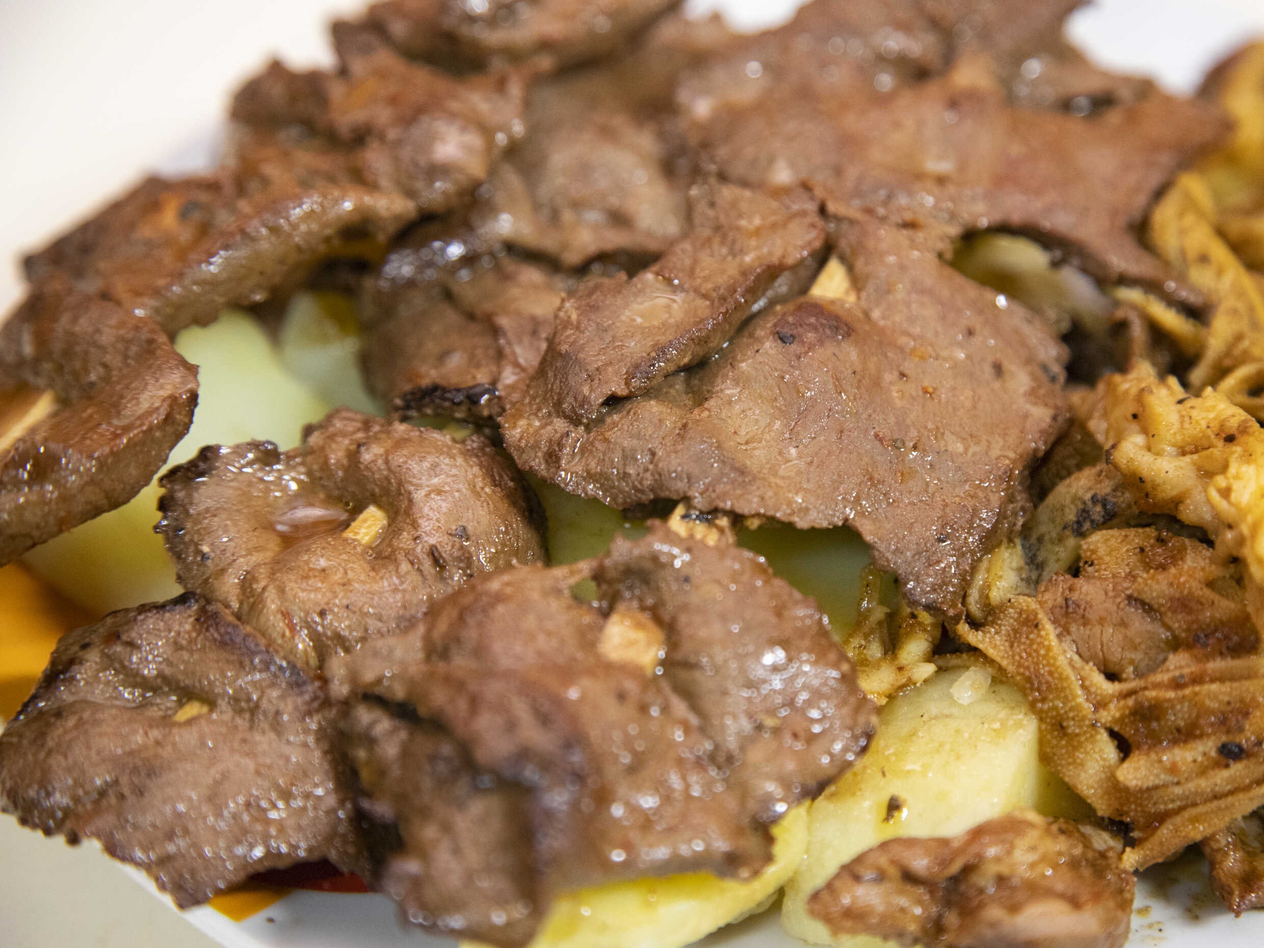 Combinado de rachi, pancita, molleja y papa.