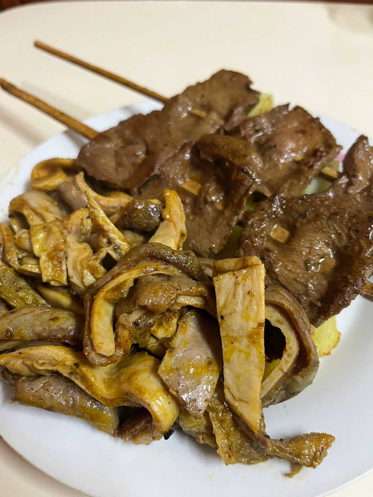 3 Palitos de Anticucho, Rachi, Pancita y Molleja