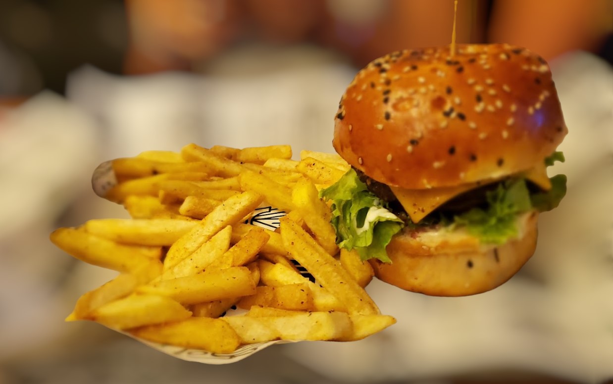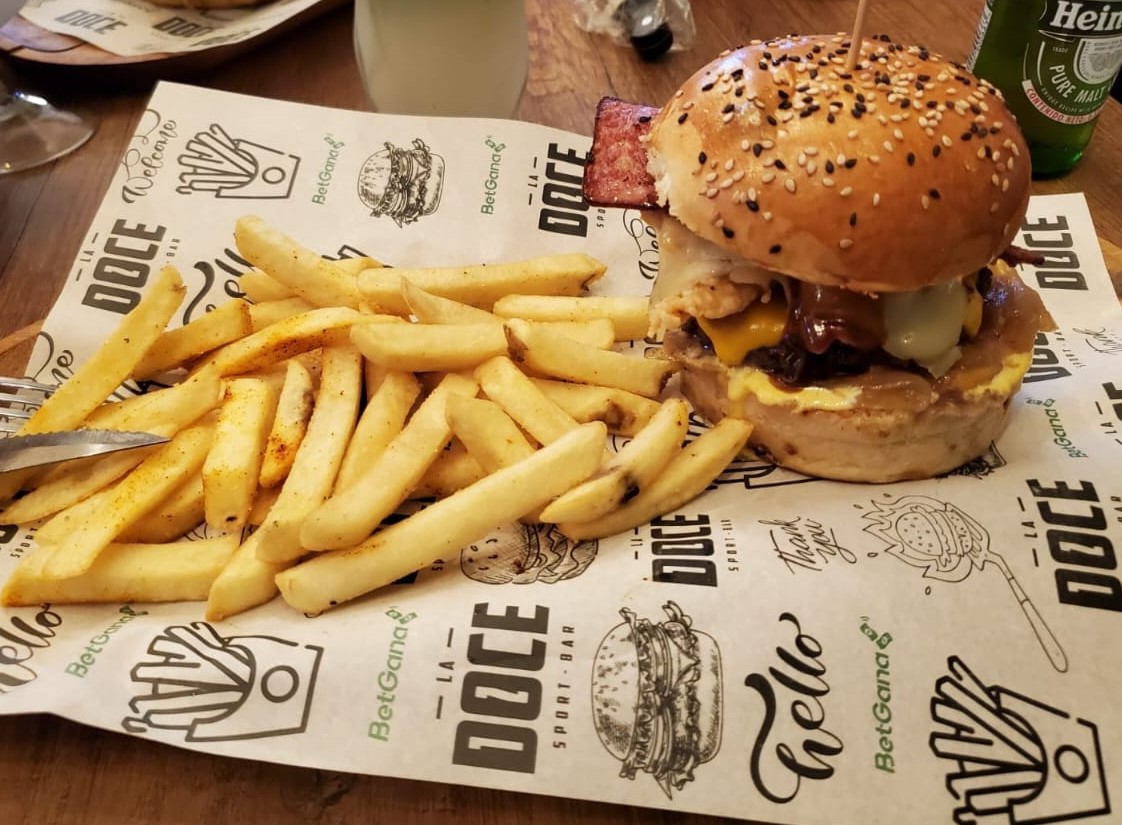 Hamburguesa de carne, jamón, queso, huevo frito, papas fritas, lechuga y cremas.