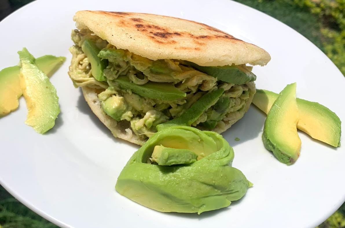Arepa rellena con pollo deshilachado, aderezado con mayonesa de la casa y palta, mantequilla y guasacaca