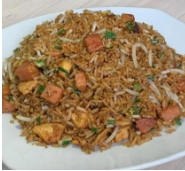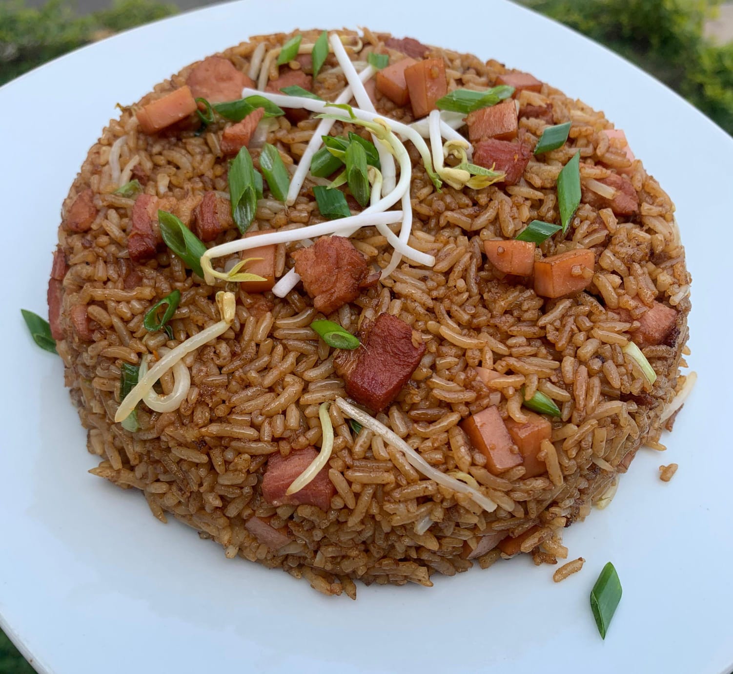 Arroz frito con trozos de chancho ahumado y jamon acompañado de germinados, cebolla china y aderezos