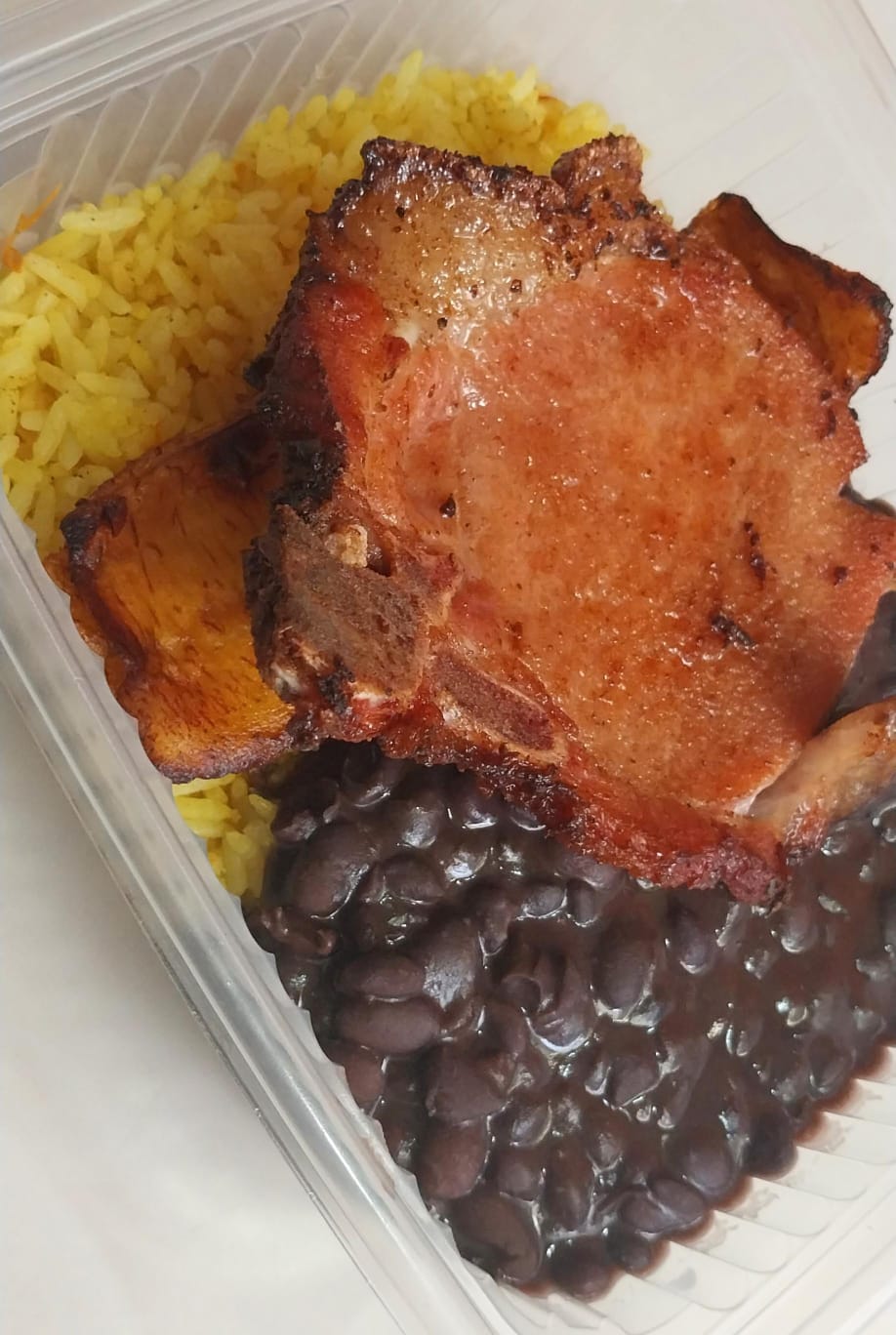 Chule ahumada con arroz, tajadas de plátano frito y caraotas (frijol negro)