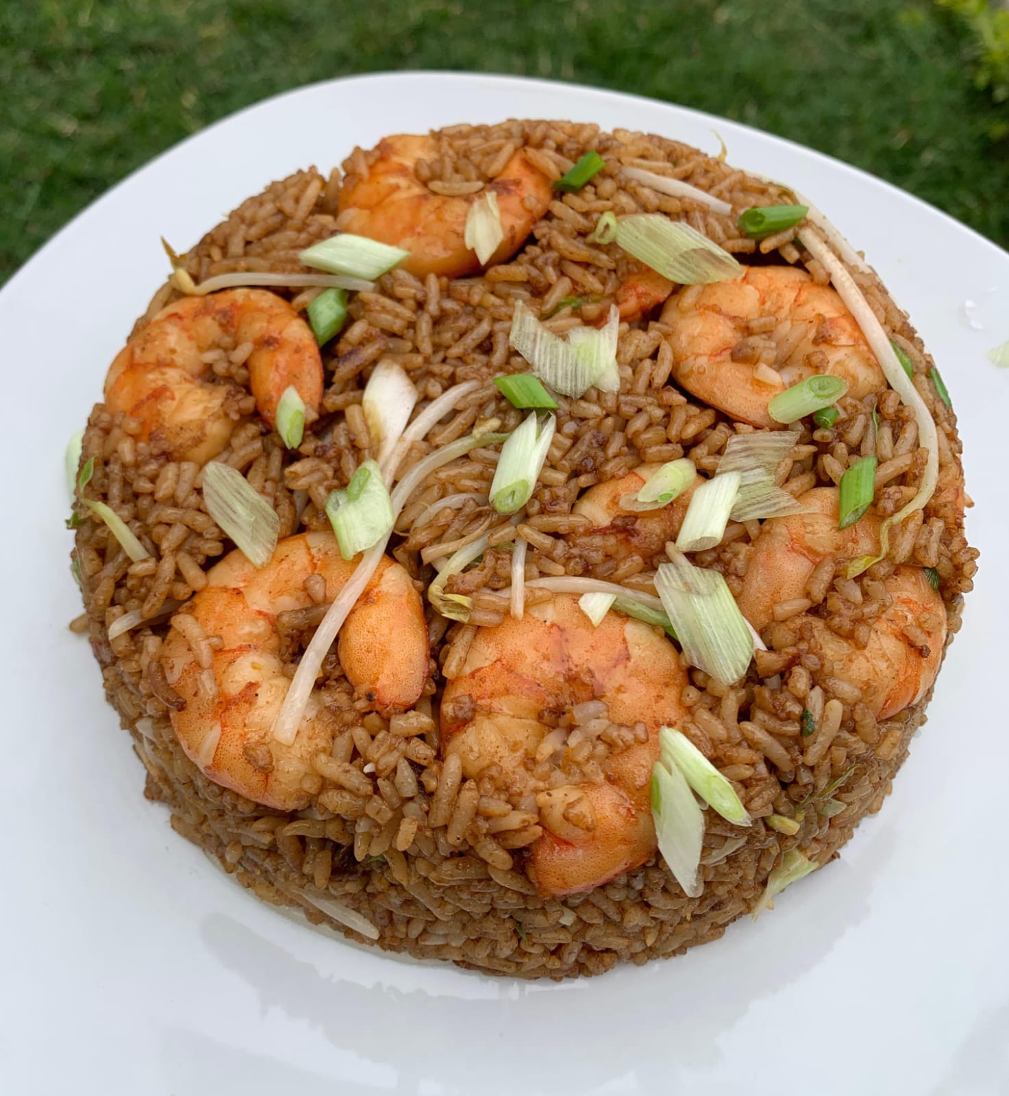 Arroz frito con camarones y jamón acompañado de germinados, cebolla y aderezos