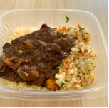 Higado encebollado con arroz, tajadas de plátano frito, ensalada rallada de col y zanahoria con aderezo cremoso americano
