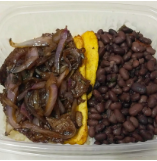 Higado de res encebollado con arroz, tajadas de plátano frito y caraotas (frijol negro)