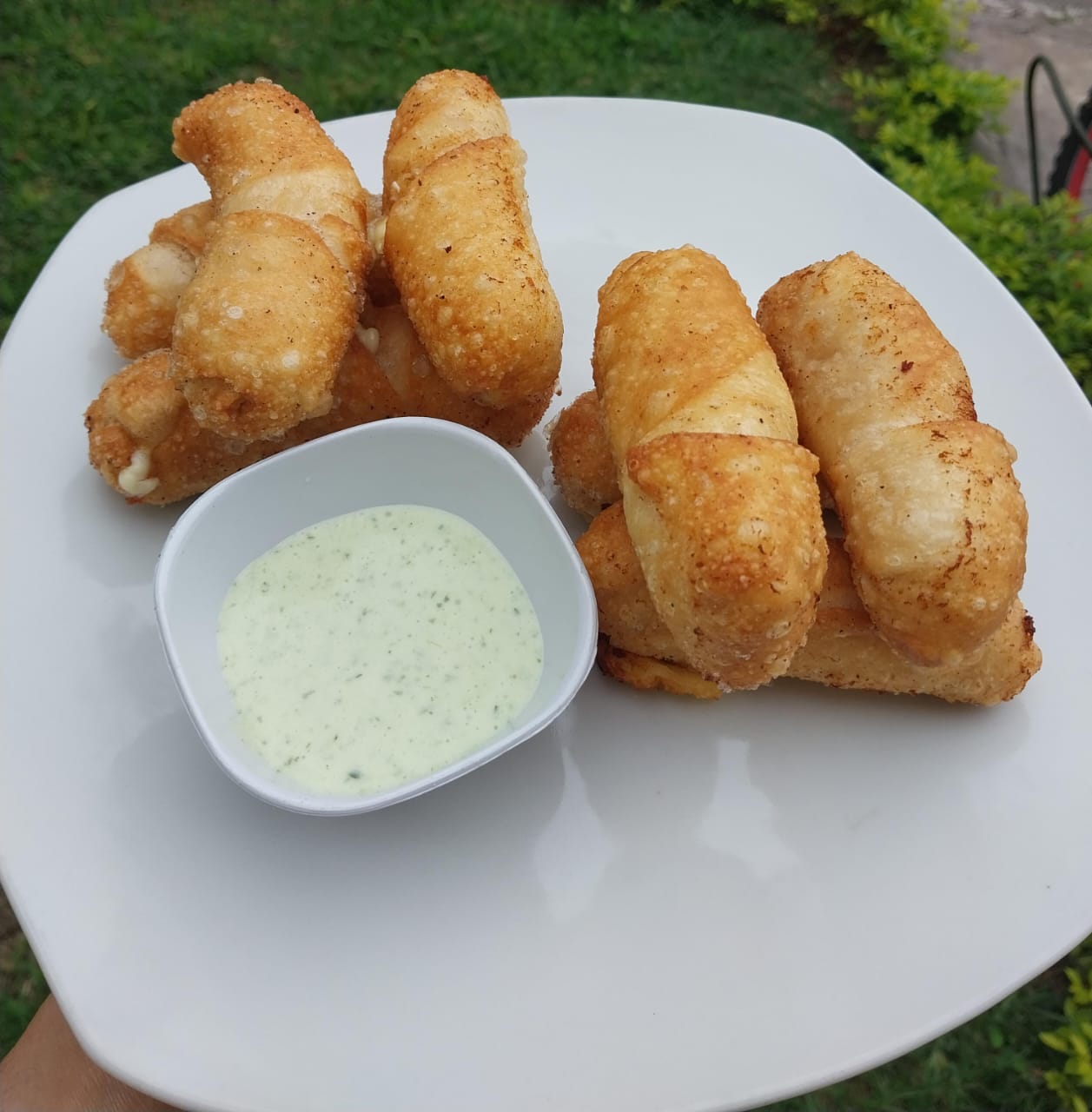 8 unidades de tequeños de queso acompañados con salsa de ajo de la casa