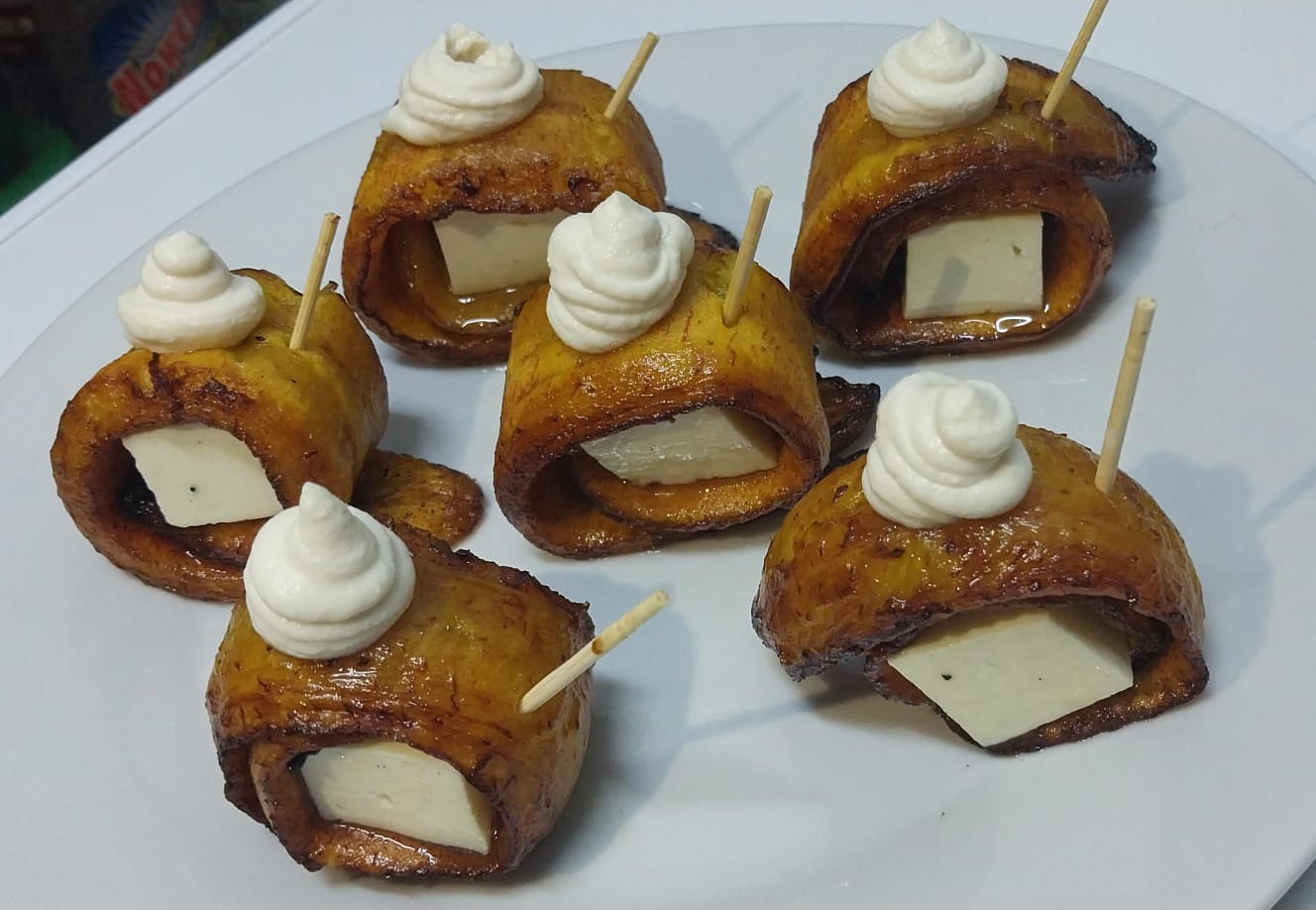 Tajadas de plátanos fritos, rellenos de queso coronado con nata