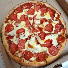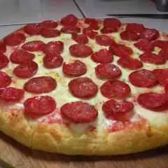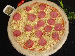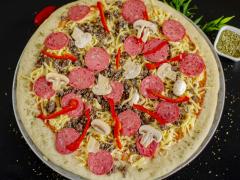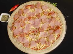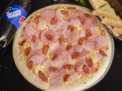 Ingredientes: salsa de tomate, queso mozzarella, cabanossi, pepperoni y jamón.