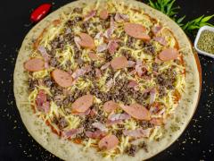 Ingredientes: salsa de tomate, queso mozzarella, cabanossi, tocino y hot dog.