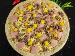 Ingredientes: salsa de tomate, queso mozzarella, carne picada, piña y jamón.