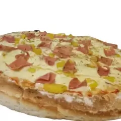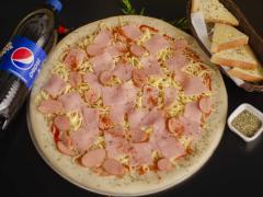 Ingredientes: salsa de tomate, queso mozzarella, tocino, aceituna y jamón.