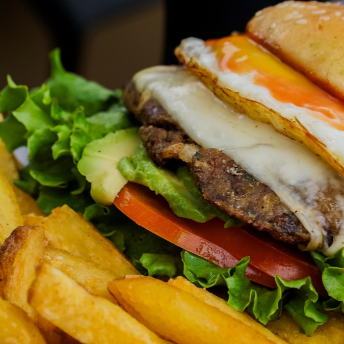Jugosa hamburguesa con cebolla caramelizada, lechuga, tomate y nuestra salsa especial. acompañada con papas fritas crocantes.