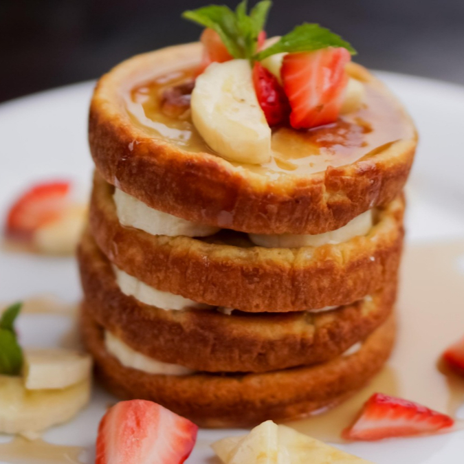 Delicioso panqueque de avena bañado en miel de maple o fudge y acompañado de frutas de estación.