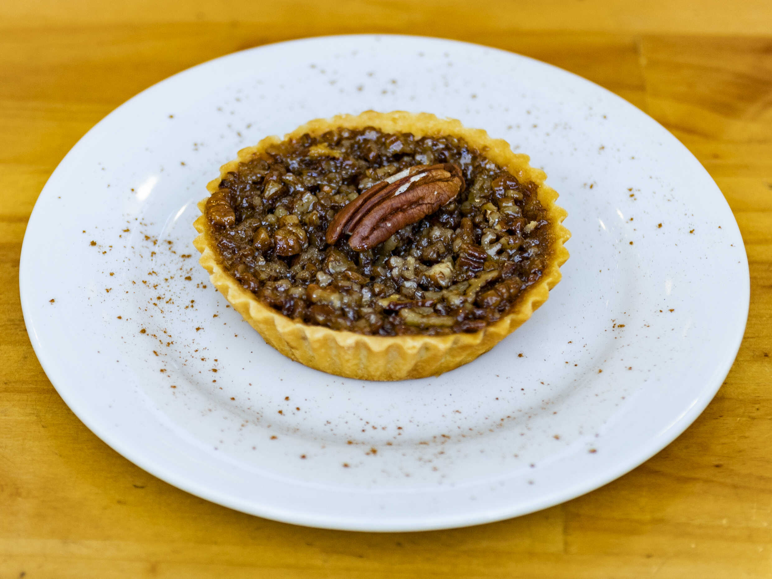 Tartaleta de masa dulce sobre una capa de compota de manzana y crocante en la parte superior.