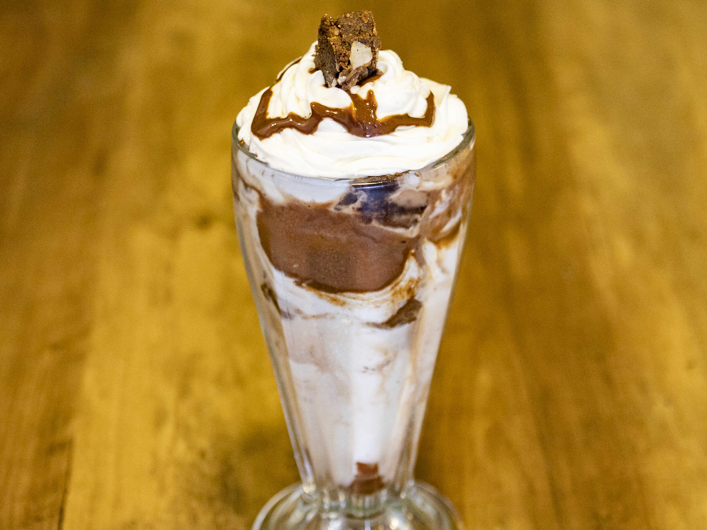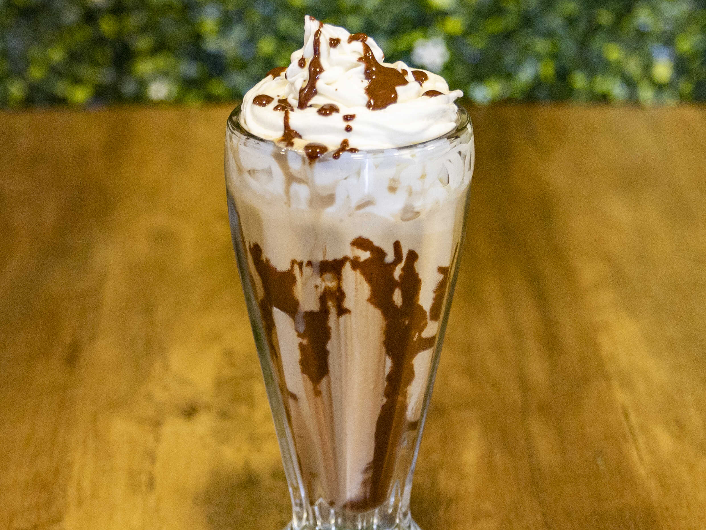 Batido de helado artesanal de chocolate, leche, topping de chantilly decorado con fudge.