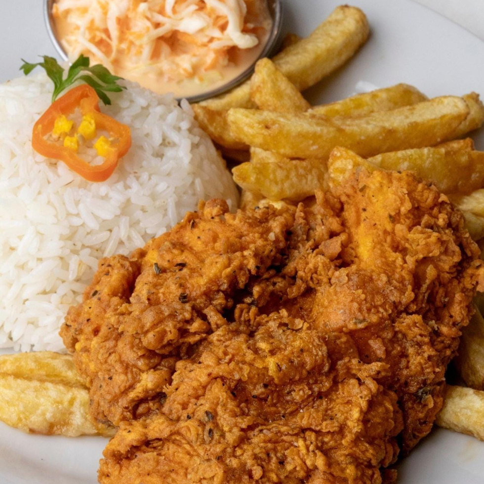 Pechuga broaster con papas fritas y arroz acompañado de...