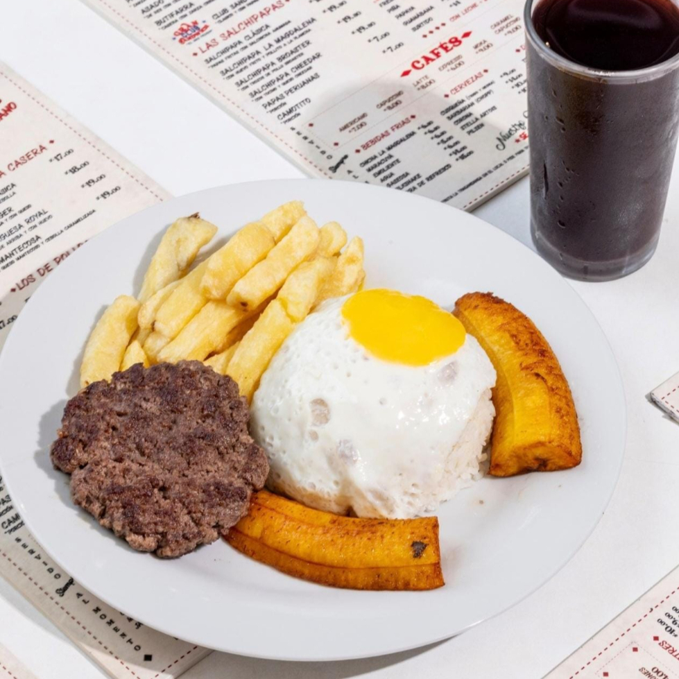 Hamburguesa con papas fritas, plátano frito, arroz y un vaso de refresco.