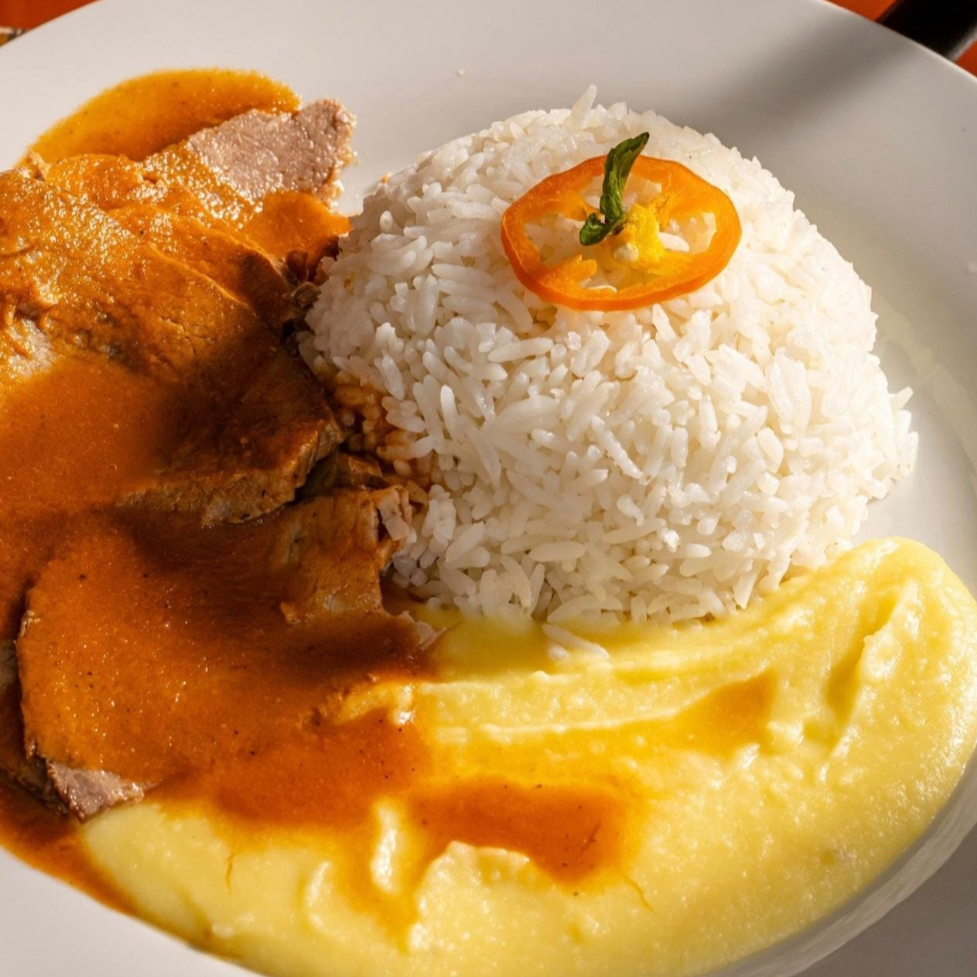 Asado de res con clásico puré, acompañado de un refresco.