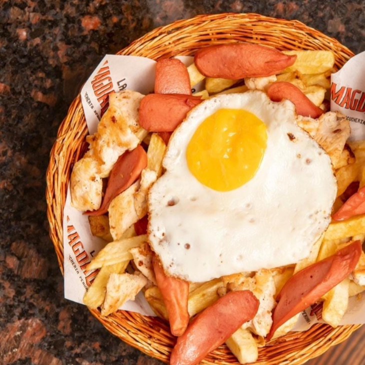 Delicioso Sánguche de Pollo Deshilachado acompañado con papas fritas al hilo y mayo.