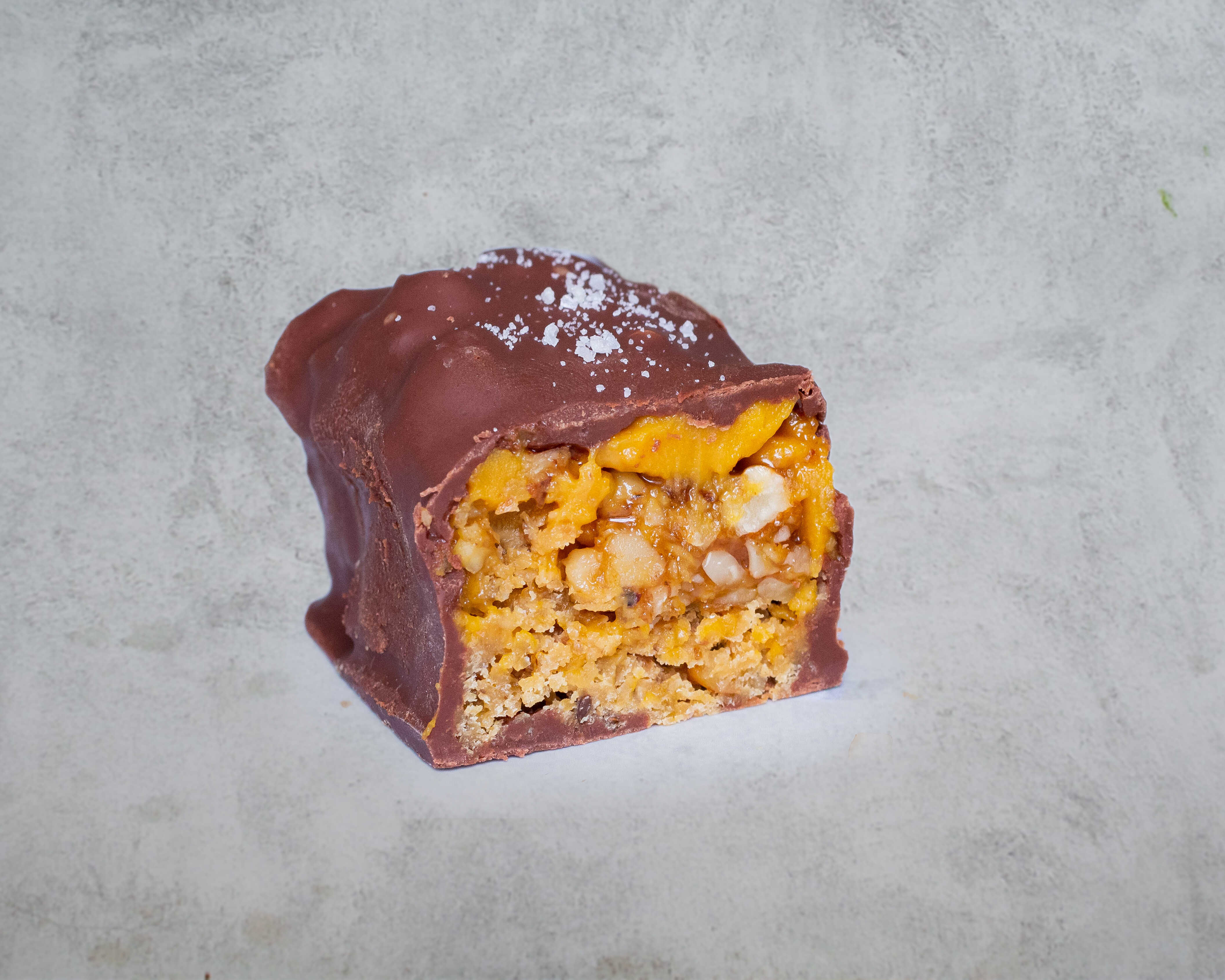 Nueva creación. Una barrita rellena de pecanas con caramelo, crema de lúcuma y manjar, cubierto por chocolate bitter libre de azúcar, caramelo y manjar hecho con panela. Contiene leche.