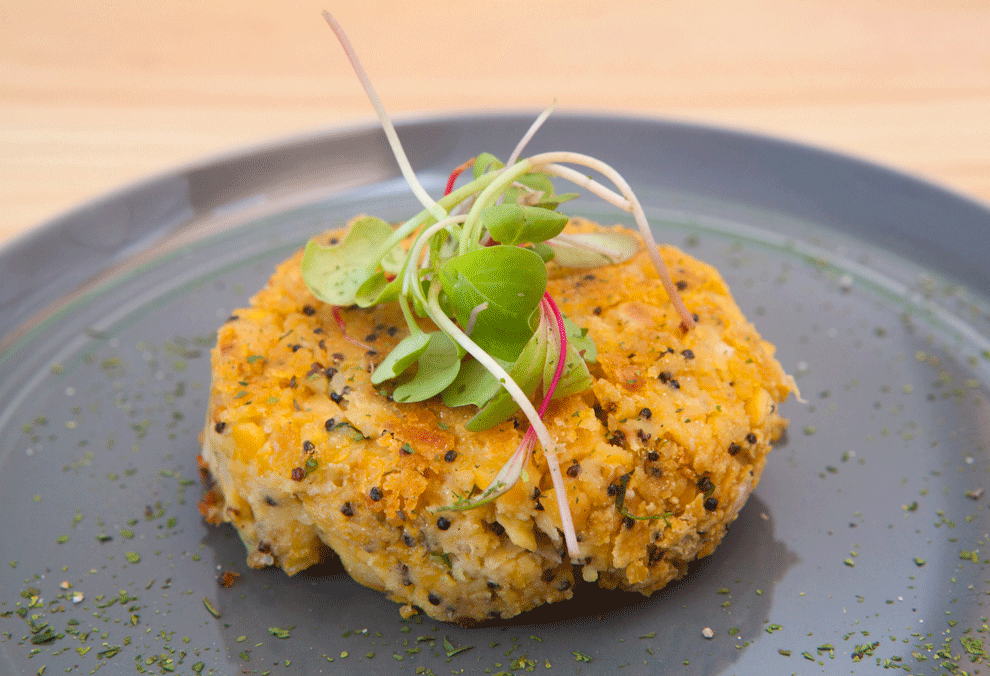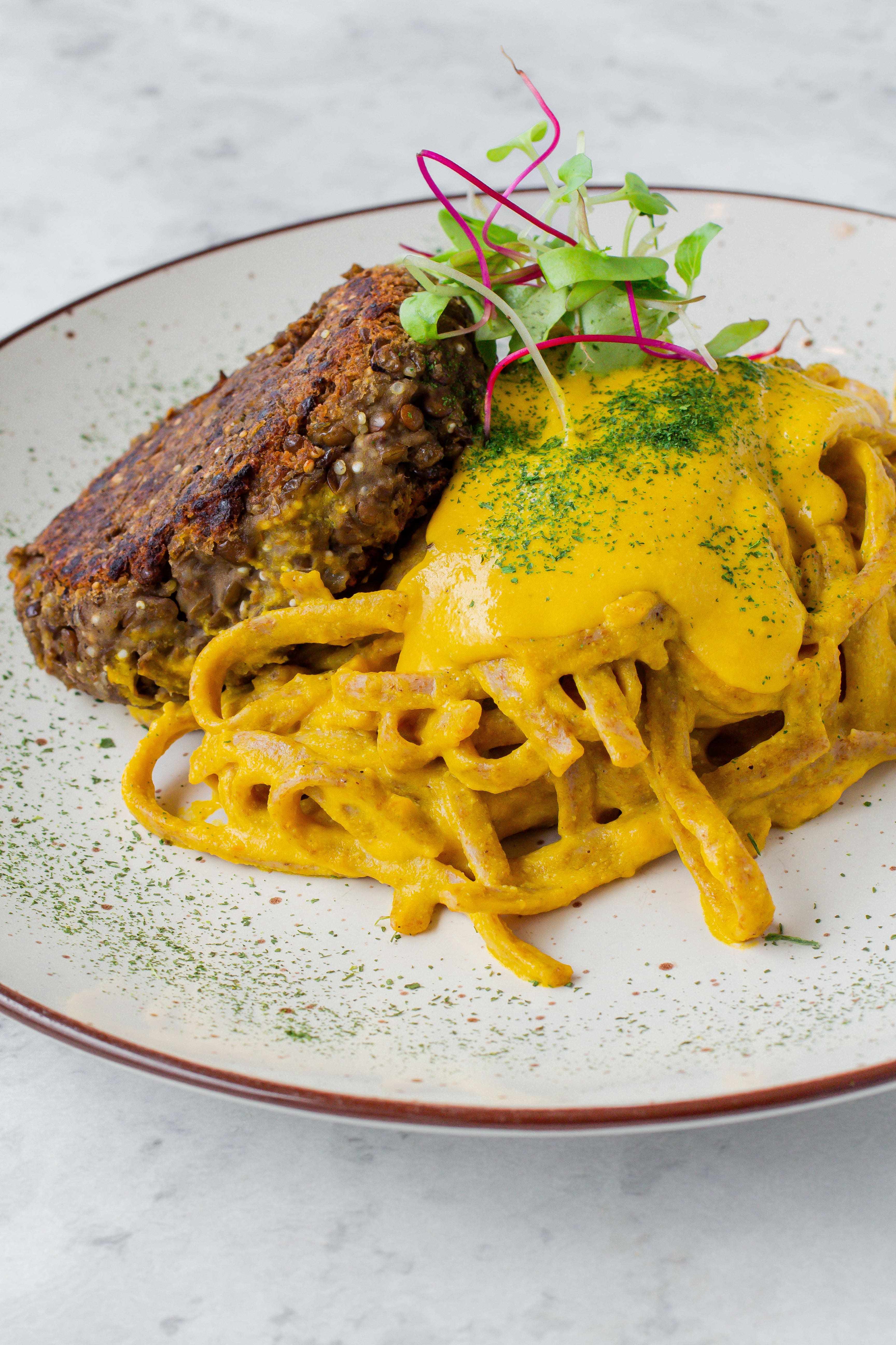 Fetuccini con crema de ají vegana, acompañada de hamburguesa de lentejas o garbanzos.