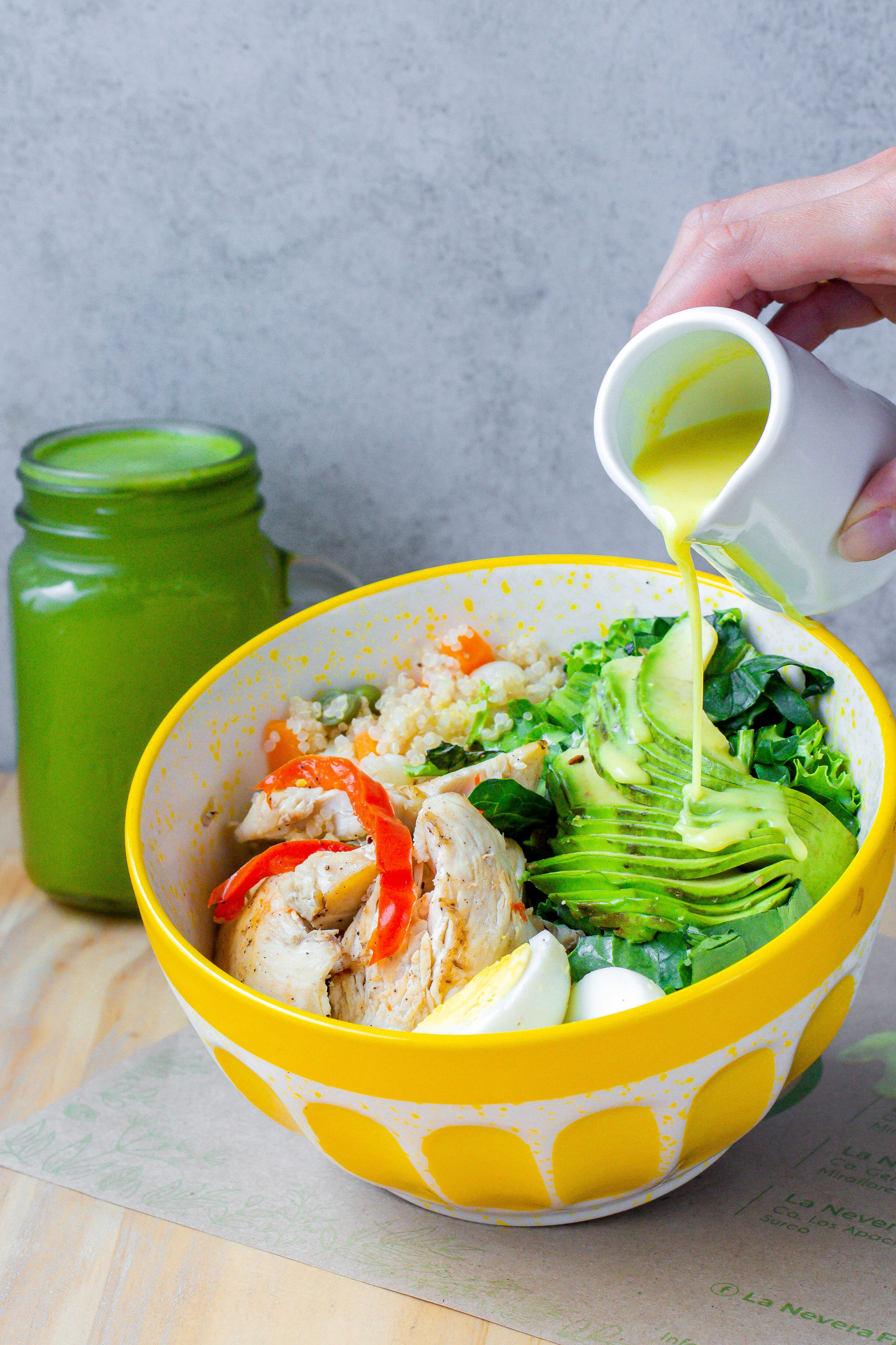 Lechuga, espinaca, palta, pimiento, huevo duro, mix de verduritas con carbohidrato a elección y proteína a elección. Con aliño la Nevera Fit.