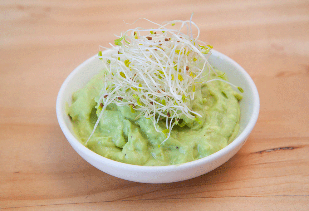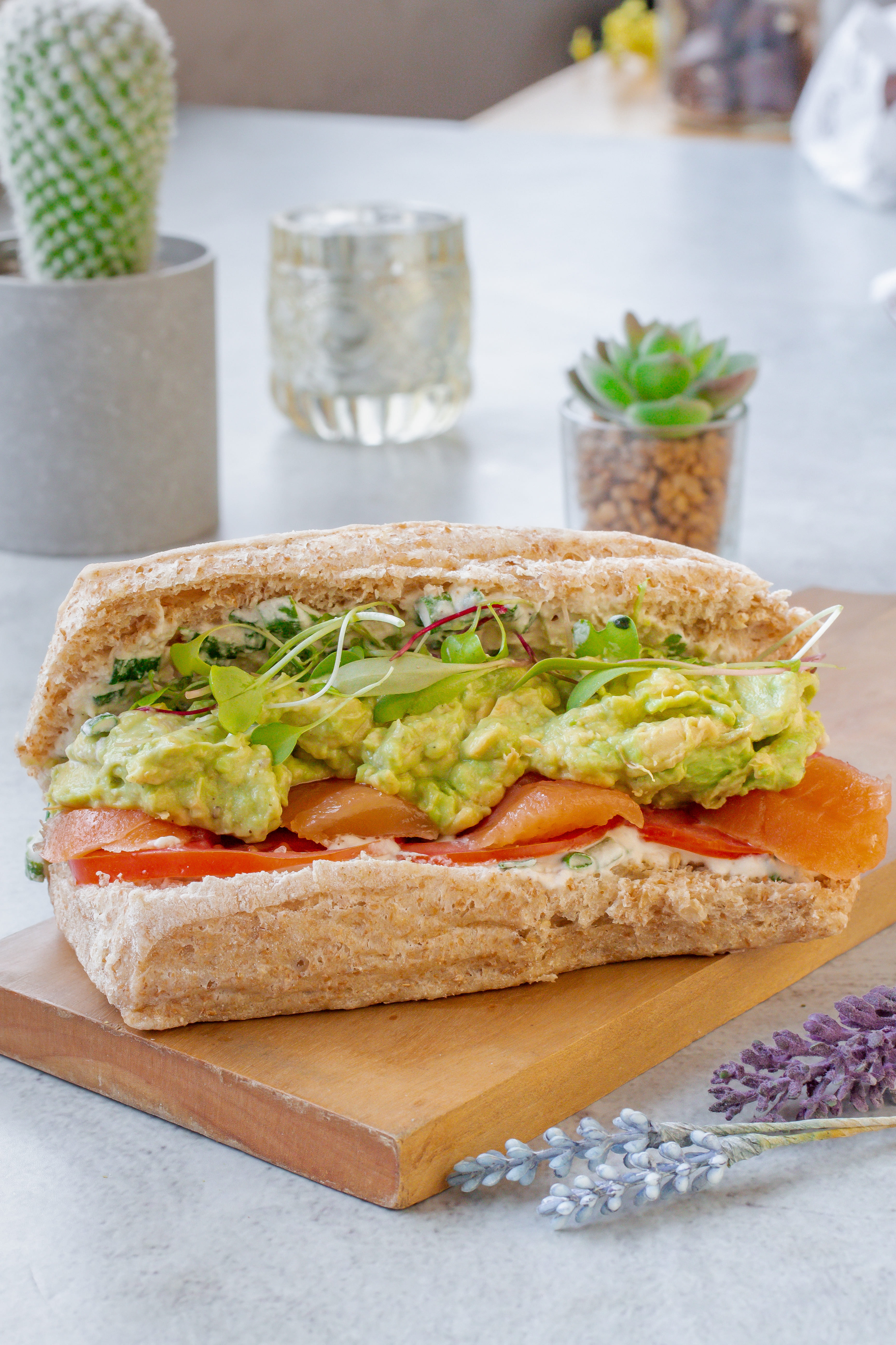 Salmón, palta, tomate y germinados con un toque de mayonesa de cashews y cebolla china.