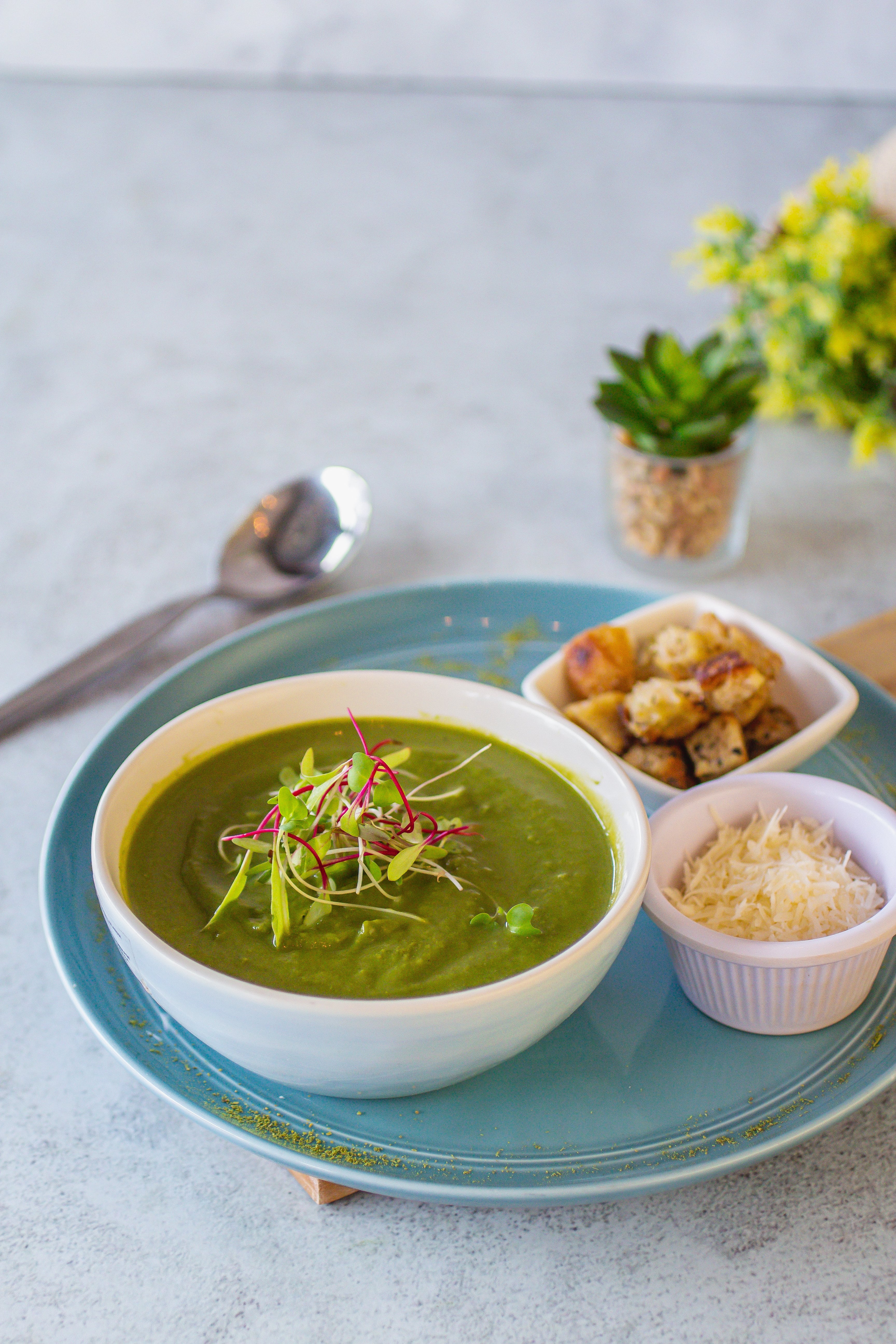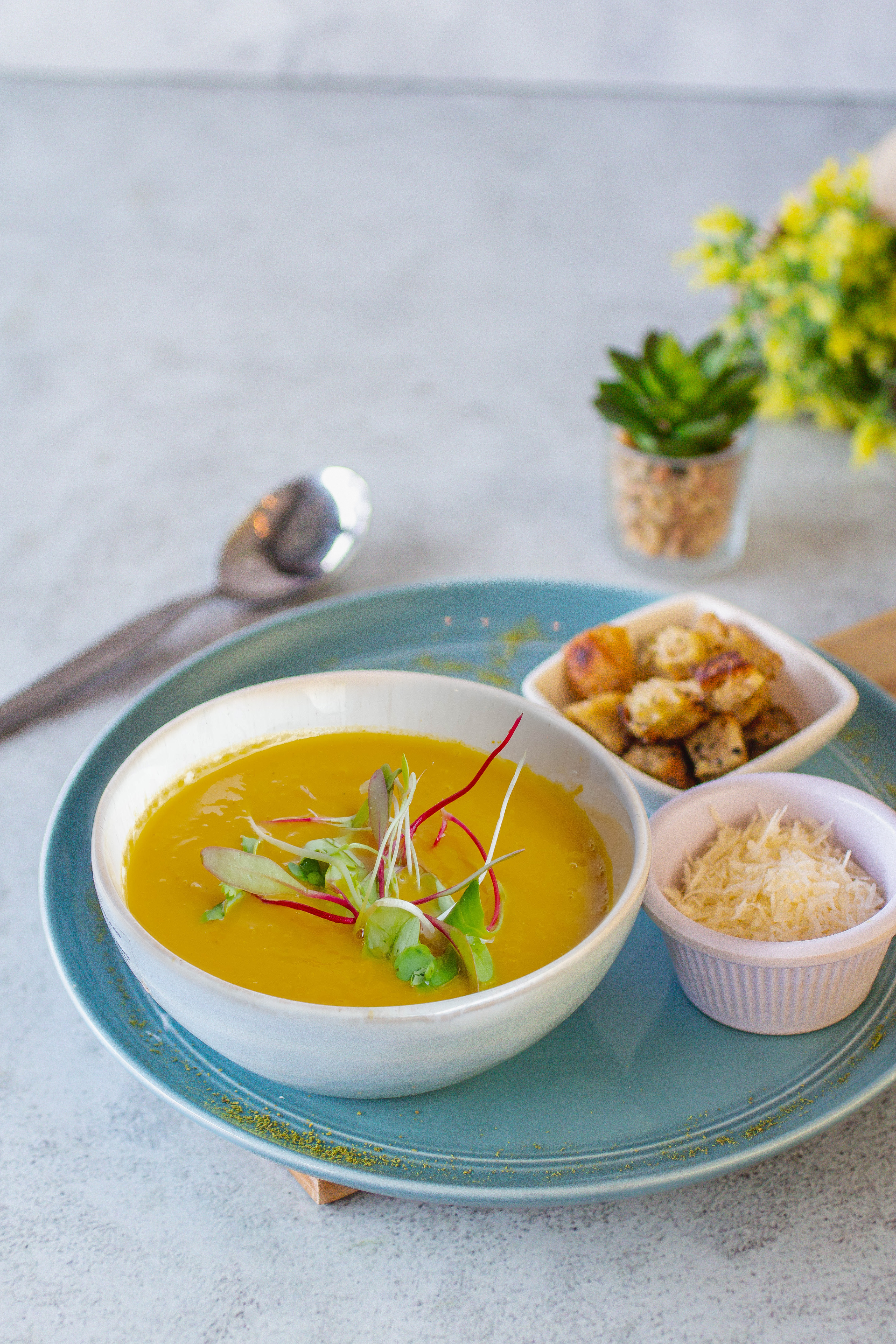 Con una pisca de aceite de oliva, cebolla, ajo y finas hierbas, acompañada de crotones de pan de avena. No contiene papa ni lácteos.