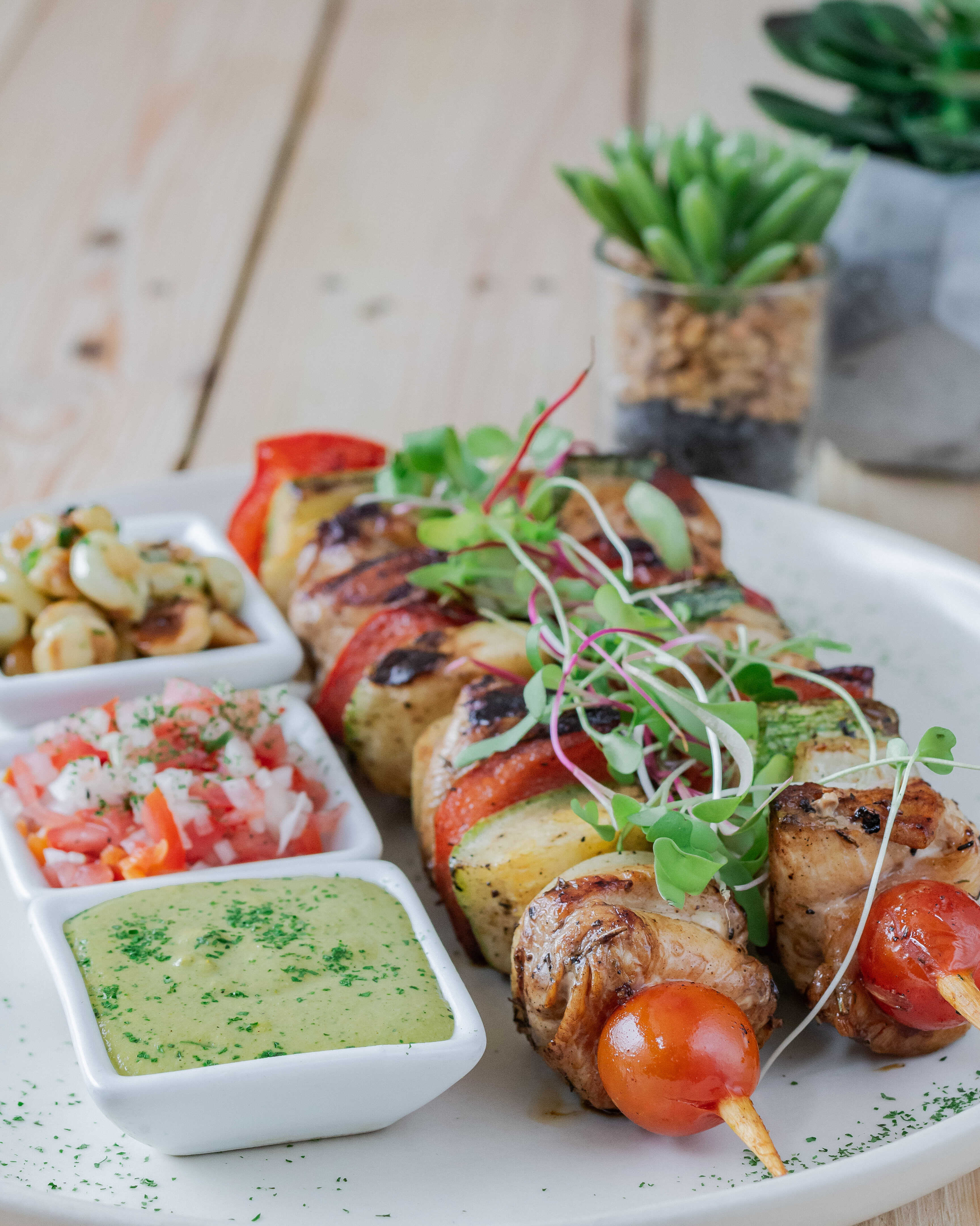 Una combinación de pollo, pimentón, zucchini, cebolla blanca, tomatillo cherry y finas hierbas al grill. Acompañado de nuestra crema de ocopa vegana, pico de gallo y choclito desgranado salteado con chimichurri.