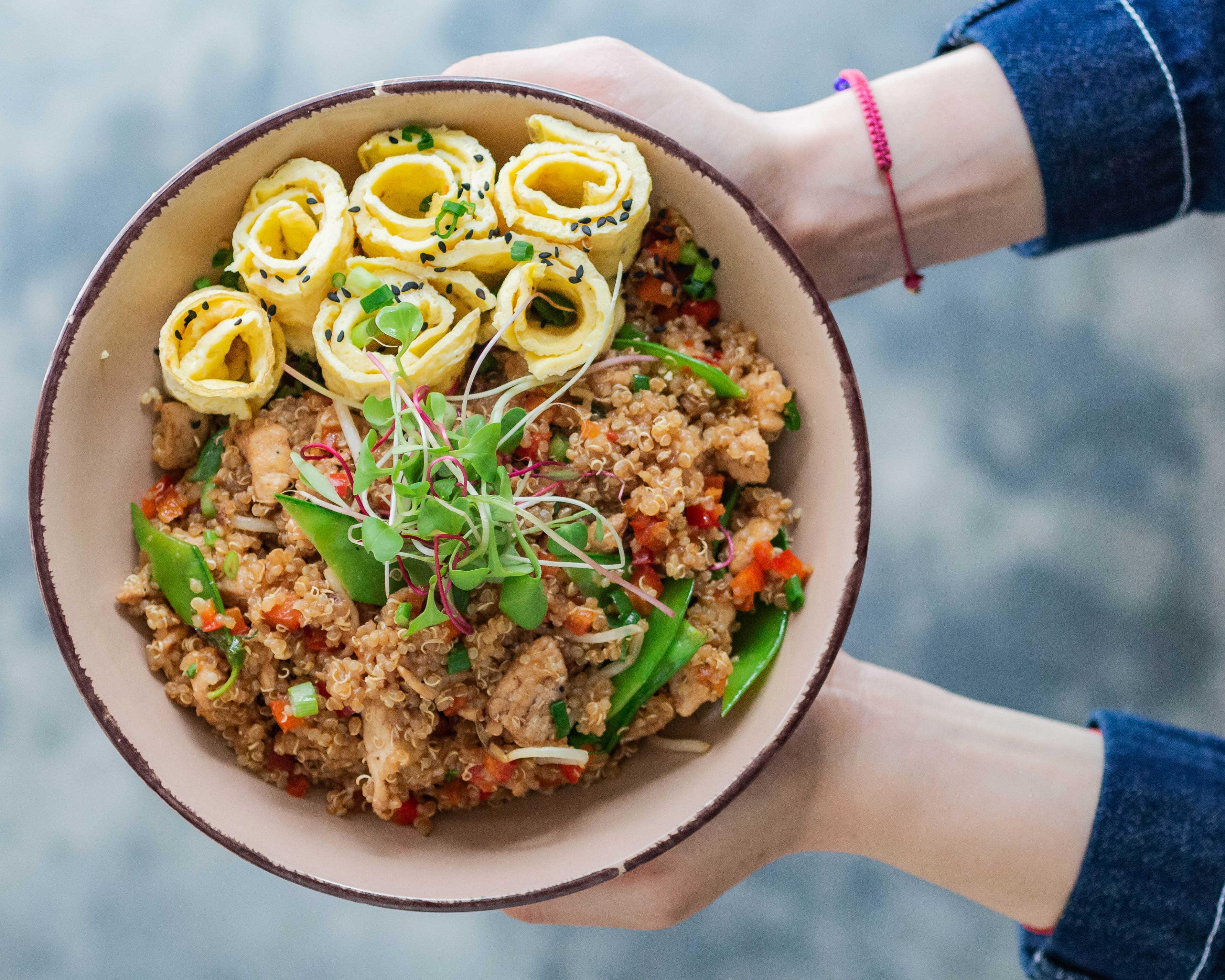 Bowl pollero salteado con salsa oriental, palta y carbohidrato a elección. Incluye zumo de limón.