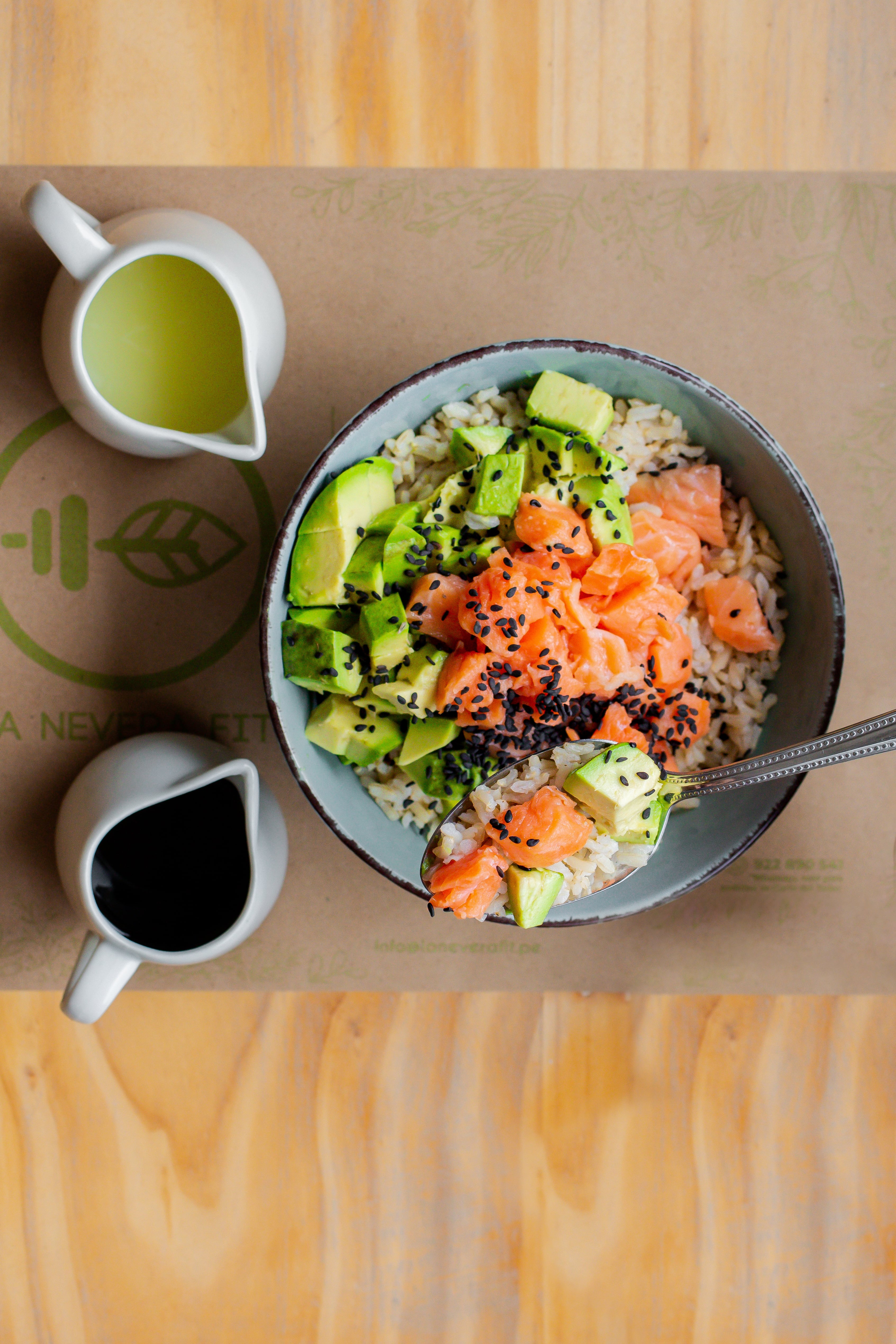 Pescado de temporada, palta y carbohidrato a elección. Acompañado por zumo de limón y sillao.