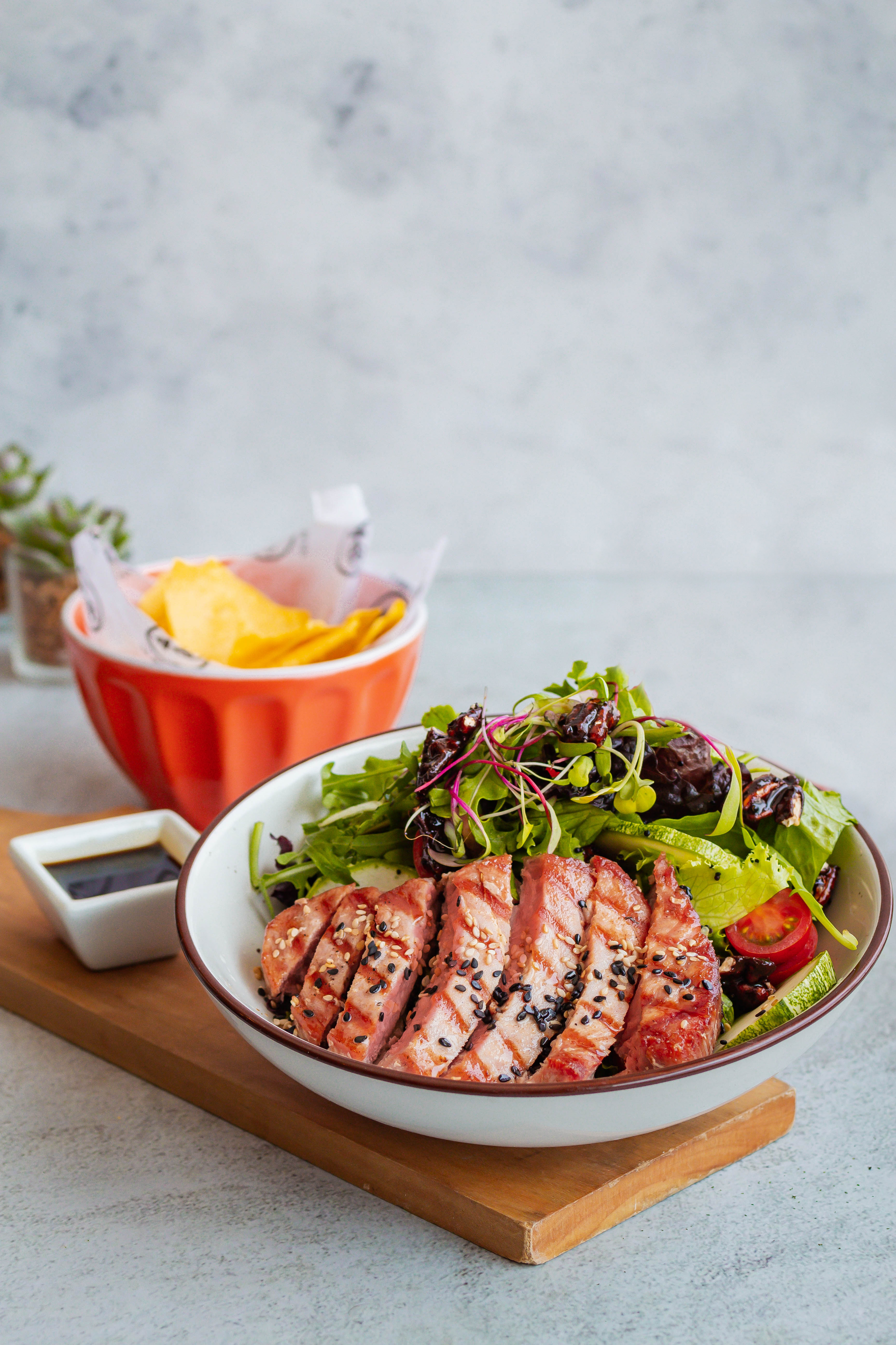 Medallón de atún sellado y sesgado, junto con un mix de lechuga, quinoa, zucchini, tomate cherry y pecanas caramelizadas. Acompañado de nachos y salsa teriyaki.
